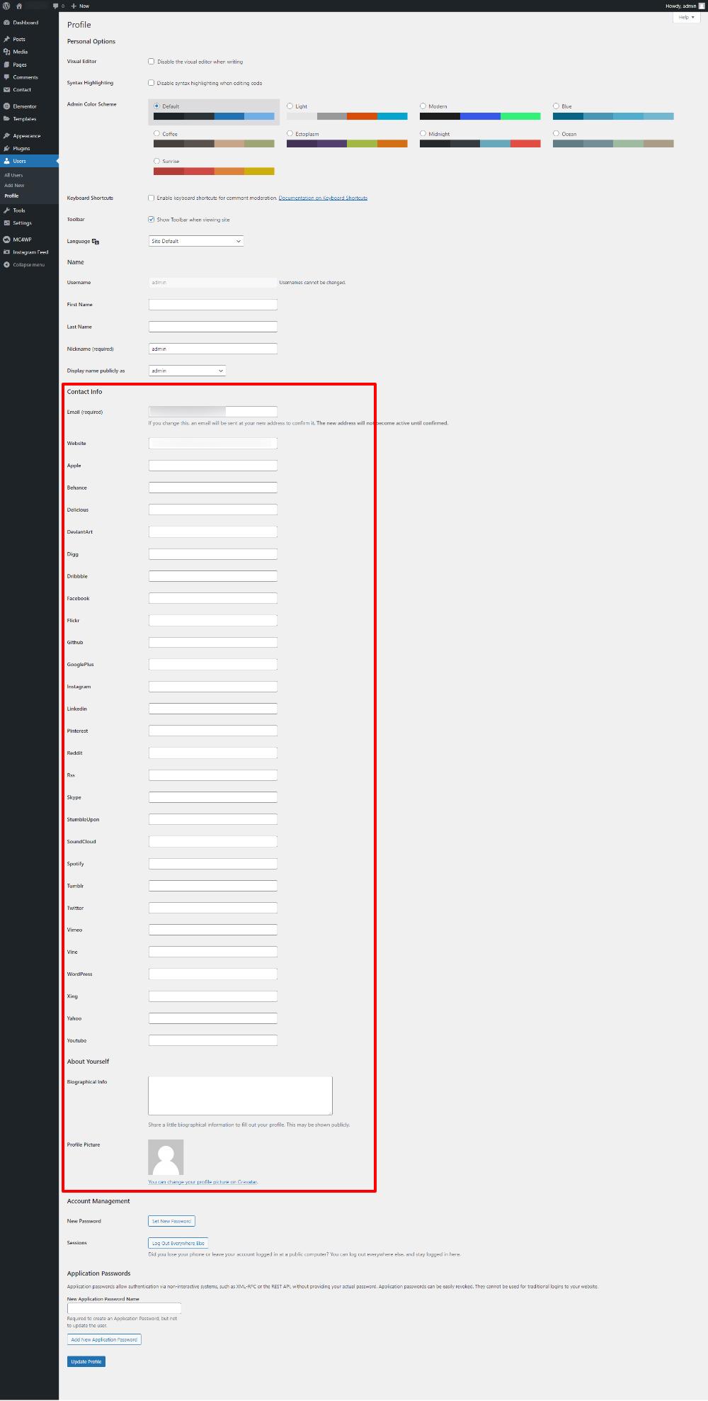 3. **Author Social Profiles:** Easily include an author's social profile by accessing the author's user profile. Locate the "Contact Info" section